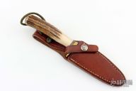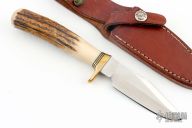 This Model 8-4 by Randall Made Knives features a satin finished blade with sharpened top edge, .168" blade thickness, .999" blade depth, hidden tang construction. Especially suitable for small fish and feathered game. Brass guard and stag grip with black/brass spacers. Comes with a brown leather sheath.  Has seen light use and has been resharpened, otherwise good condition.