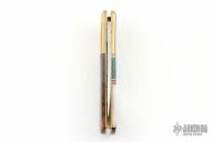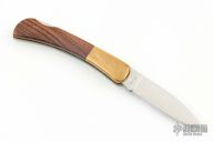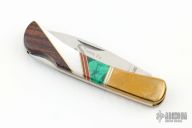 This Lockback was customized by Santa Fe Stoneworks. It features a satin finished blade with nail nick. The handle has brass bolsters, stone and pearl inlays, brass liners, stainless steel backspacer. Has a some scuffs and scratches, great condition otherwise.