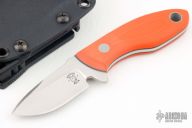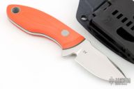 This Hydra by Tom Krein features a satin finished blade with .121" blade stock and 1.040" blade depth, full tang construction. The handle has orange G-10 scales with black liners, has a lanyard hole. Includes a kydex belt sheath. Dated 2014. Has a couple very light scratches, otherwise excellent condition.