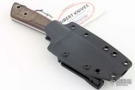 This knife from Shane Sibert  features a satin finished drop point blade with notched thumbrest, .146" blade stock and 1.010" blade depth, full tang construction. The handle has green canvas micarta scales. Comes with a kydex sheath w/ TekLok. Comes with COA. Excellent condition.