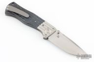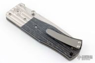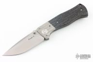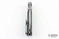 This Epicenter by Todd Rexford features a hand rub satin finished blade with long swedges, notched thumbrest and dual thumbstuds. The handle has titanium dovetailed bolsters, carbon fiber scales, blasted titanium liners, anodized titanium barrel spacers, bead blast finished tip up titanium clip. Nice detent, lockup and blade seating. Excellent condition.