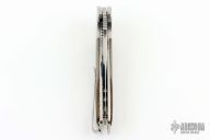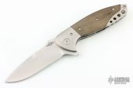 This Nitro by Peter Carey features a satin finished blade with notched thumbrest and flipper. The handle has titanium bolsters, green canvas micarta scales, satin titanium liners, tip up titanium pocket clip. Nice lock up, blade seating and detent. Has a few light scratches, otherwise excellent condition.