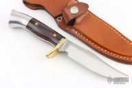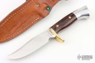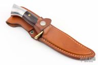 This knife by Westmark features a satin finished blade with false top edge, .169" blade stock and 1.220" blade depth, 3/4 full tang construction. The handle has a brass guard and pins, aluminum butt cap, dymondwood scales. Comes with original box, papers and sheath. Excellent condition. #23832