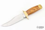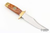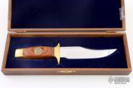This fixed blade by Smith and Wesson features a wood handle with brass guard and butt cap. Mirror polished bowie style blade with .246" blade stock and 1.360" blade depth. Has "Texas Rangers 1823-1973" stamped on blade and a "Texas Rangers Commemorative Commission" inlay on handle. Has a couple scratches, otherwise excellent condition. Includes original box. "TR17575" stamped on the spine of the blade.