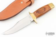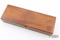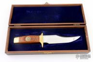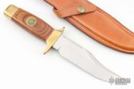 This fixed blade by Smith and Wesson features a wood handle with brass guard and butt cap. Mirror polished bowie style blade with .246" blade stock and 1.360" blade depth. Has "Texas Rangers 1823-1973" stamped on blade and a "Texas Rangers Commemorative Commission" inlay on handle. Has a couple scratches, otherwise excellent condition. Includes original box and sheath. "TR9692" stamped on the spine of the blade.
