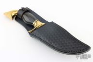 This Skinner from Beaver USA features a satin finished blade with .185" blade stock, 1.484" blade depth, hidden tang construction. The handle has a brass guard and butt, black dymondwood grip, black and brass spacers handle. This design - which allows you to retain the knife with your hand open/fingers splayed - was patented by Sonny Guiler in 1980 and the knife has the patent number stamped on the back of the blade along with the Beaver logo. Excellent condition. Includes original box and brown leather sheath with belt loop.
