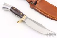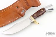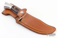 This knife by Westmark features a satin finished blade with false top edge, .166" blade stock and 1.516" blade depth, 3/4 full tang construction. The handle has a brass guard and pins, aluminum butt cap, dymondwood scales. Comes with original box, papers and sheath. Excellent condition. #18042