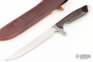 This fixed blade from Tom Barminski features a mirror polished blade with .192" blade stock and .939" blade depth, full tang construction. The handle has cocobolo scales with aluminum rear bolsters with lanyard hole. Includes original box, COA and brown leather sheath with belt loop. Excellent condition.