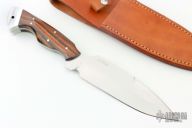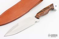 This fixed blade from Tom Barminski features a mirror polished blade with sharpened top edge, .182" blade stock and 1.814" blade depth, full tang construction. The handle has dymondwood scales with aluminum rear bolsters with lanyard hole. Includes original box and brown leather sheath with belt loop. Excellent condition.
