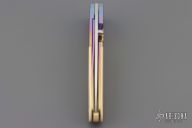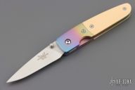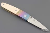 This Mel Pardue design liner lock by Benchmade features a satin finished blade with single thumb stud. Anodized and orange peel finished titanium bolsters with ivory paper micarta scales, anodized and orange peel finished titanium liners and a micarta backspacer. Includes a padded zippered case.  Excellent Conition.