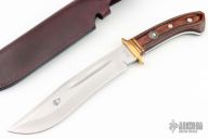 This Bowie from Rigid Knives features a satin finished blade with a false top edge and fullers, .217" blade stock and 1.750" blade depth, hidden tang construction. The handle has a brass guard, dymondwood scales over an aluminum frame, and red/black/brass spacers. Comes with original box and brown leather sheath. Has a couple light scratches, otherwise excellent condition.
