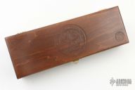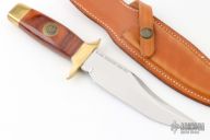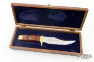 This fixed blade by Smith and Wesson features a wood handle with brass guard and butt cap. Mirror polished bowie style blade with .246" blade stock and 1.360" blade depth. Has "Texas Rangers 1823-1973" stamped on blade and a "Texas Rangers Commemorative Commission" inlay on handle. Excellent condition. Includes original box and sheath. "TR18869" stamped on the spine of the blade.
