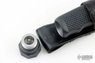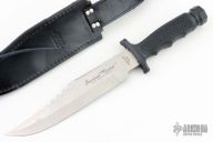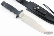 This Survival Master by Saburo features a satin finished blade with sawteeth on the spine, .161" blade stock and 1.746" blade depth, hollow handle constructon. The handle is black coated aluminum handle with removable butt cap with compass in the butt. Comes with a black leather sheath with sharpening stone. Has some light scratches, otherwise excellent condition. #B565