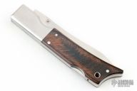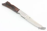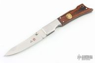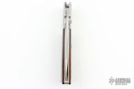This Gunstock 1 from Al Mar Knives features a drop point satin finish blade with thumbstud. The handle is comprised of stainless steel bolsters and titanwood scales with faux bullet casing over stainless liners and lockbar. Lanyard tube in pommel. Comes with a small leather belt sheath designed to look like a holster, and original box and papers. Excellent condition.