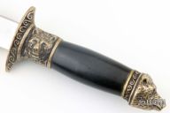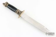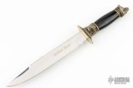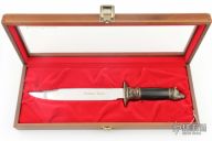 This collector's knife from Kershaw is #4228 of 5000 made in Solingen, Gemany. Features mirror polish blade with "Golden Bear" engraving. Blade is 1/4" thick and 1 1/4" deep. Brass guard and pommel feature heads of a bear. Comes with display case and original box. Excellent condition.