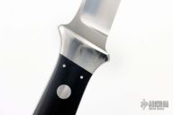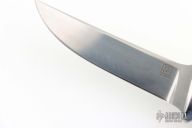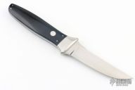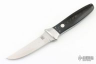 This Tanto by Bob Lum features a hand rub satin finished upswept blade with .194" blade stock and .838" blade depth, full tapered tang construction. The handle has stainless steel boslters with black linen micarta scales with stainless pins. Has some scratches, has been used, otherwise good condition.