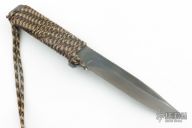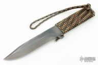 This knife by Ruana features a black clip point blade with sharpened top edge and notched thumbrest, .202" blade stock and 1.233" blade depth, full tang construction with cord wrapped grip. Has some light scratches, otherwise excellent condition.