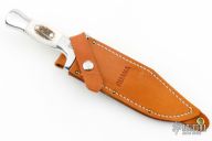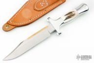 This 29A Junior Bowie by Rudy Ruana features a satin finished blade with a sharpened top edge and hammered brass parry guard, .223" blade stock and 1.196" blade depth, hidden tang construction. The handle is cast from aluminum with elk inserts. Comes with brown leather sheath. Excellent condition.