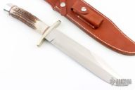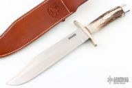 The Model 12 was made to meet the demand for a heavy-duty sporting knife of the Bowie type. This knife has a 9" carbon steel blade with sharpened top edge, .227" blade stock and 1.679" blade depth, hidden tang construction. The handle has a forward curved nickel silver guard and a duralumin butt, stag handle with red/white/blue spacers. Nickel silver escutcheon with "J.H.H." engraved. Includes a brown leather sheath. Excellent Condition.