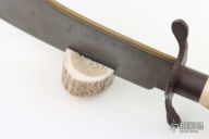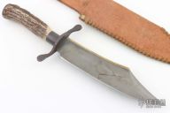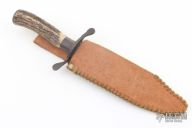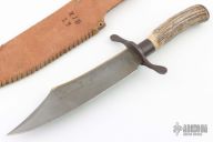 This knife by HG Bourne features a blued clip point blade with false top edge and a brass parry guard, .163" blade stock and 1.834" blade depth, hidden tang construction. The handle has a forged steel guard and butt with a stag grip. Comes with brown leather sheath. Has some scratches and patina, otherwise good condition.