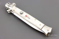 This swivel bolster auto by Latama features a dagger blade with a false top edge. Nickle silver guard and rear bolster and White/Black Buffalo horn scales. Nice function, strong firing and lock up. Excellent condition.
