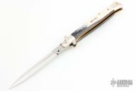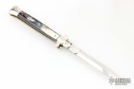 This picklock auto by Latama features a dagger blade with a false top edge. Nickle silver guard and rear bolster and White/Black Buffalo horn scales. Nice function, strong firing and lock up. Excellent condition.