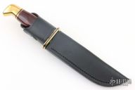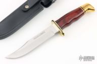 This Model 119 by Buck Knives features a satin finished clip point blade with false top edge and fullers, .176" blade stock and 1.086" blade depth, hidden tang construction. The handle has an brass guard and butt, and a dymondwood grip. Comes with original box and leather sheath. Has some light scratches, otherwise good condition.