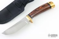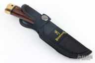 This knife by Browning Knives features a mirror finished blade with notched thumbrest, .120" blade stock and 1.058" blade depth, hidden tang construction. The handle has a brass guard and butt, dymondwood grip with black spacers. Comes with original box and nylon sheath. Excellent condition.