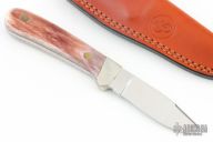 This hunter by Canal Street Cutlery features a mirror polished blade and full tang construction, .136" blade stock and .895" blade depth. The handle has nickel silver bolsters with amber camel bone scales. Comes with leather sheath and original box with papers. Excellent condition.