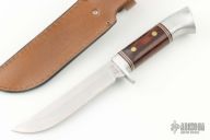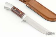 This knife by Western Cutlery features a satin finished blade with .177" blade stock and .975" blade depth, hidden tang construction. The handle has an aluminum guard, dymondwood grip with black/white/red spacers and an aluminum butt. Comes with original box, papers and brown leather sheath. Blade stamped "WESTERN U.S.A. W36". Excellent condition.