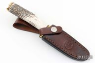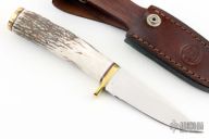 This knife by Smith and Wesson features a mirror finished blade, .152" blade stock and 1.035" blade depth, hidden tang construction. The handle has a brass guard and butt, stag grip with black/red spacers. Comes with original box and brown leather sheath. Has a few light scratches, good condition.