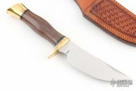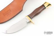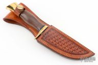 This knife by Browning Knives features a polished blade with notched thumbrest, .176" blade stock and 1.273" blade depth, hidden tang construction. The handle has a brass guard and butt, rosewood grip with black spacers. Comes with original box, papers and hand tooled brown leather sheath. Excellent condition.
