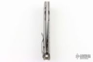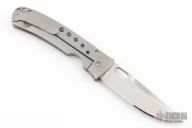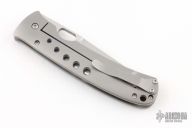 This Large TNT by Tom Mayo features a hand rub satin finished blade with thumbhole. The handle has a bead blasted titanium frame with hole pattern, titanium standoffs and tip up clip. Nice detent lockup and blade seating. Has been resharpened to a mirror polished edge, on a Wicked Edge sharpening system. Has some light scuffs and scratches, excellent condition otherwise.