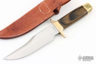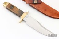 This Bowie from Smith & Wesson features a mirror polished clip point blade with a nearly sharpened top edge, .248" blade stock and 1.350" blade depth, hidden tang construction. The handle is comprised of a brass guard and pommel with wood handle. Includes original box, papers and leather sheath. Excellent condition. #28016