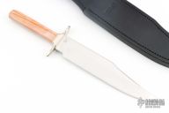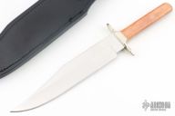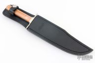 This Bowie by Buck Knives features a mirror polished clip point blade with .179" blade stock and 1.463" blade depth, full tang construction. The handle is comprised of a nickel silver guard, giraffe bone scales. Includes original box, papers and black leather sheath with belt loop. Numbered 095/100 on blade. Excellent condition.