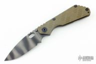 This MS SNG framelock folder by Mick Strider features a tiger stripe blade and a Crosshatch Ranger Green G-10 and flamed titanium frame and tip up titanium clip. Includes Hinderer "Lock Bar Stabilizer" for maximum reverse lock retention. Nice detent, lockup and blade seating. Excellent condition.
