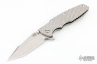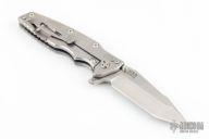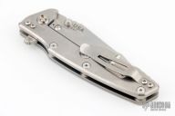 This Eklipse Tri-Way by Hinderer Knives features a stonewashed harpoon tanto blade with dual thumbstuds, flipper and notched thumbrest. The handle has a titanium frame and liner with a textured titanium scale and tumbled titanium clip and hardware. Nice detent, lockup and blade seating. Comes with original box, card and extra hardware. Also comes with original blue g10 scale and ti liner. Has a two tiny rolls on the blade edge, they are very hard to see without magnification. It could be removed with one pass on a strop. Excellent condition.