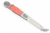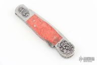 This Engraved Slipjoint by Bob Conley features a hand rub satin finished drop point blade with nail nick and file worked blade spine. The handle is comprised of engraved steel double bolsters, inlays, steel liners and backspring. Blade favors the right side. Excellent condition.