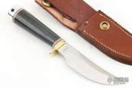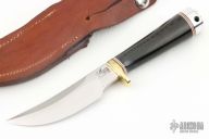 This Chukker from Blackjack Knives features a satin finished blade with .165" blade stock and .985" blade depth, hidden tang construction. The handle has a brass guard with red white and black spacers, black linen micarta grip, aluminum pommel. Comes with original box, papers and leather sheath with belt loop. Excellent condition.