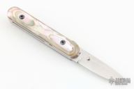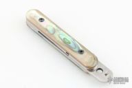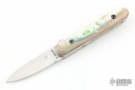 This knife by Francis Boyd features a polished blade with thumbdisc. The handle has pearl scales over stainless steel liners and backspacer. Has some light scratches and patina, otherwise great condition. #33