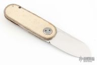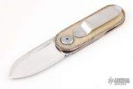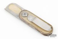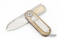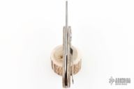 This Rare Boyd Large Button Lock Folder has a satin polish finished drop point blade with nail nick and swedge. Handle has ray skin, filigree, checkered button, and a stainless tip down clip. Excellent lockup and centered blade. Has half stop, that requires the button be pushed to fully open the blade. Comes with a zipper case. Has some light scratches and patina, otherwise excellent condition.