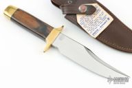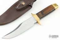 This Bowie from Smith & Wesson features a mirror polished clip point blade with a nearly sharpened top edge, .248" blade stock and 1.350" blade depth, hidden tang construction. The handle is comprised of a brass guard and pommel with wood handle. Includes original box, papers and leather sheath. Has some light spotting on the blade, otherwise excellent condition. #11472