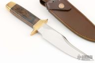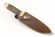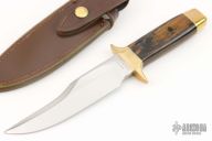 This Bowie from Smith & Wesson features a mirror polished clip point blade with a nearly sharpened top edge, .248" blade stock and 1.350" blade depth, hidden tang construction. The handle is comprised of a brass guard and pommel with wood handle. Includes original box, papers and leather sheath. Excellent condition. #21522