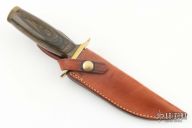 This knife by Smith and Wesson features a matte finished spear point blade with sharpened top edge, .243" blade stock and 1.281" blade depth, hidden tang construction. The handle has a brass guard, hollow wood handle and a knurled brass butt cap that is removable. Has some pitting on the guard, otherwise excellent condition. Made in the 70's. #36707. Comes with original box, papers and sheath.