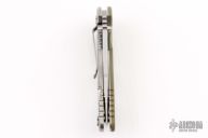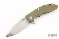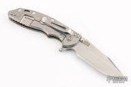 This XM-18 by Rick Hinderer features a stonewash finished blade with notched thumbrest and flipper. The handle has a green G-10 scale, stonewashed titanium frame, and a tip up or down reversible flamed titanium clip and copper filler tab, lanyard hole at the butt. Comes with original box and extra hardware. New condition.