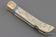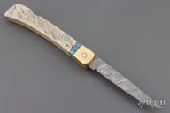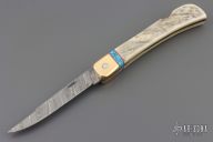 This is a lockback folder by Michael Igo features a Damascus blade with a single nail nick. The handle features brass bolsters/liners with stag scales and turquoise spacers. Includes a padded zippered case. Excellent Condition.