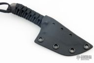 This knife by Mick Strider features a tiger stripe blade with notched thumbrest, paracord wrap, .070" blade stock and .896" blade depth, full tang construction with cord wrapped handle. Comes with kydex sheath. Has some sheath marks, otherwise excellent condition.