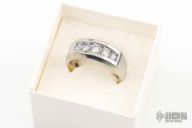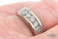 14kt white gold Men's Channel Set Diamond Ring - Size 10.5. Has 5 diamonds, the largest one in the center is .150" in diameter. There are 3/4 of a carat of diamonds in the ring. Comes with original sales receipt and was originally $2600. Has some light scratches, otherwise good condition.