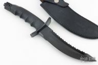 This Black Warrior from Al Mar Knives features a black coated blade with serrated top edge, .235" blade stock and 1.480" blade depth, hidden tang construction. The handle has a black stainless steel double guard, black rubberized handle, and a black stainless steel butt. Comes with original black leather sheath. Has a couple light scratches and wear on the guard, otherwise excellent condition.