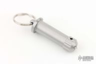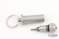 This pocket-size tool kit is a complete disassembly tool for the XM folder. It includes a built-in spanner wrench, which makes it very easy to hold both the wrench and the knife at the same time while making pivot adjustments. The head unscrews from the main body, which contains a precisely machined screwdriver blade that matches the slot on the pivot screw of the XM-18. The head will also hold any standard 1/4″ bit. In the case of the XM-18 it is a 5/64″ hex that works on the handle screws. The crossed drilled hole in the male end is there so you can use it as a “T” handle for extra torque. These are made from 17-4 PH hardened stainless steel, with a bead blast finish. Has a few scuffs, otherwise excellent condition.